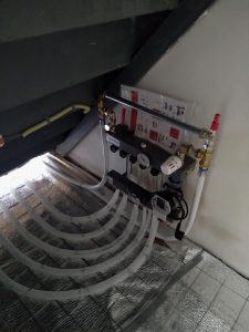 Met een magazijn van 500 m2 vloeroppervlakte hebben we doorgaans gemiddeld 100.000 tot 150.000 strekkende meter slangen van 14/16/18 mm en altijd 60 tot 100 verdelers op voorraad. Tevens worden de gegalvaniseerde draadstaalnetten, isolatie en aansluitkoppelingen vanuit ons magazijn dagelijks bijgevuld in de bedrijfsauto’s. Dat moet ook wel want er wordt dagelijks behoorlijk wat materiaal gemonteerd bij onze klanten !